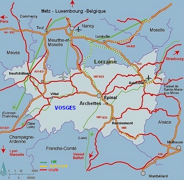La nationale 57 voie rapide du sud au nord du département passe à Arches et donne depuis Nancy accès